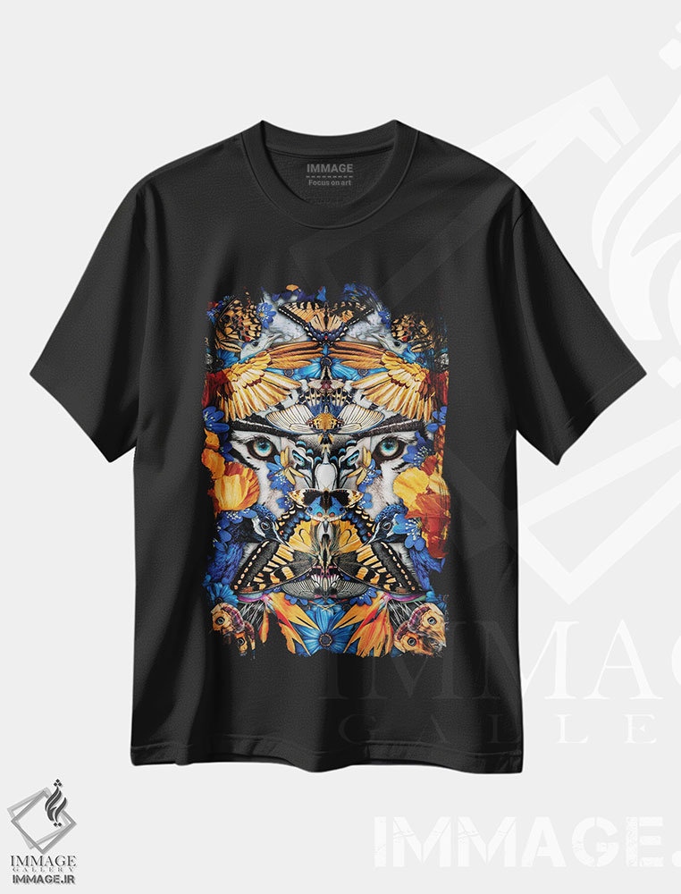 تیشرت مشکی طرح دار شیر و پروانه، هنر دیجیتال اثر آدام کازینز | فروشگاه ایماژ تیشرت طرح دار شیر و پروانه اثر آدام کازینز