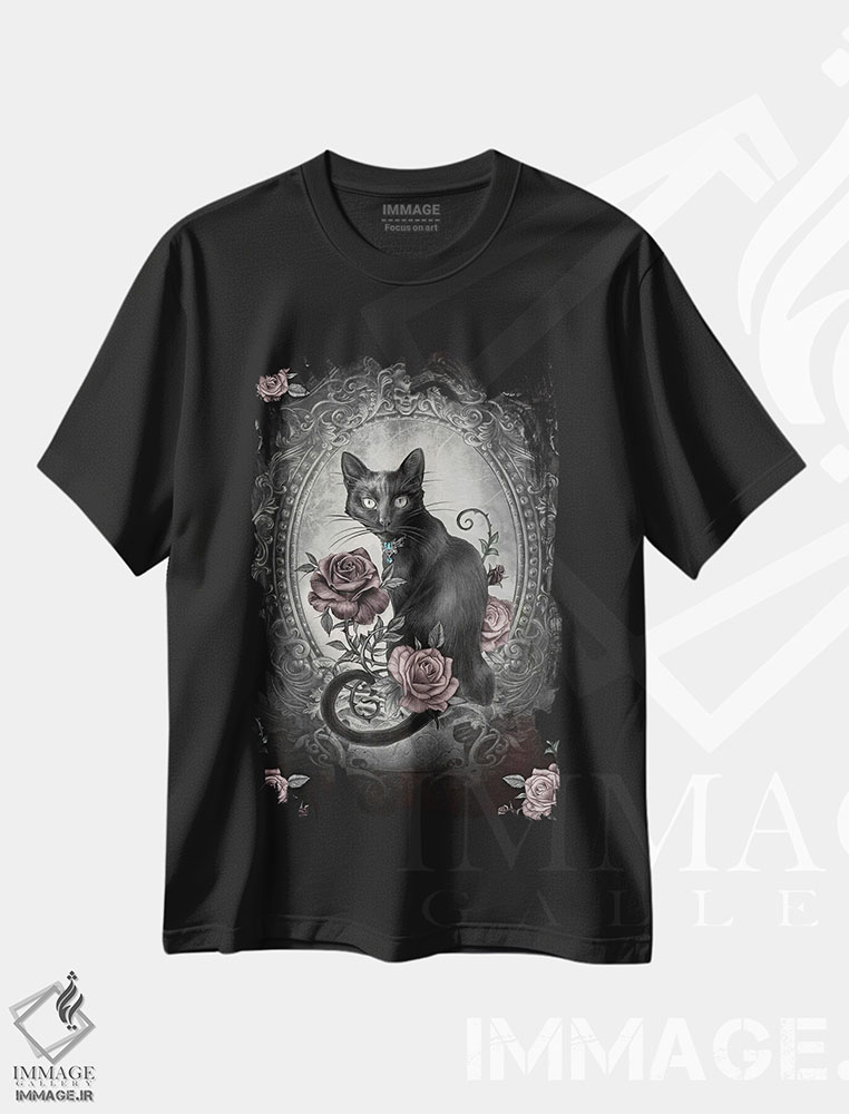 تیشرت مشکی طرح دار گربه سیاه در جنگل، هنر فاخر معاصر اثر میشل فابر | فروشگاه ایماژ تیشرت طرح دار گربه سیاه در جنگل اثر میشل فابر