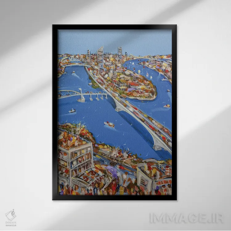 براساس پالت ترکیبی اثر، قاب تیک گرم (چوبی) پیشنهاد اول است و مشکی مات (فریم متوسط) مکمل. برای سفارشهای پروژهای با ابعاد و قابهای اختصاصی با ایماژ در تماس باشید.