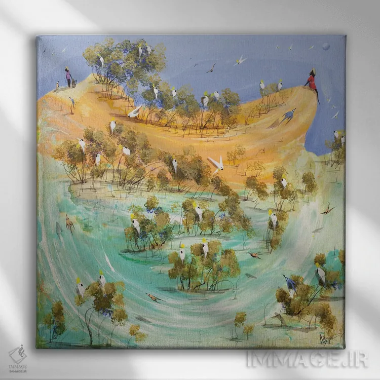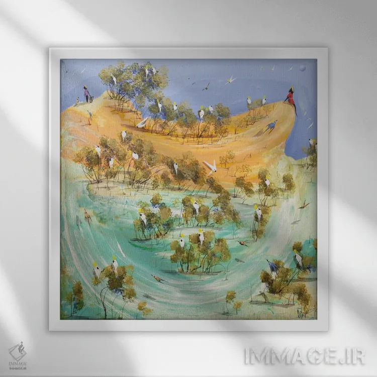 براساس پالت ترکیبی اثر، قاب تیک گرم (چوبی) پیشنهاد اول است و مشکی مات (فریم متوسط) مکمل. برای سفارشهای پروژهای با ابعاد و قابهای اختصاصی با ایماژ در تماس باشید.