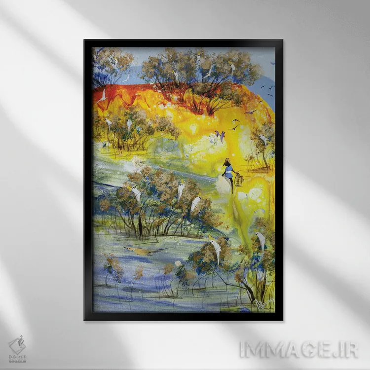 براساس پالت ترکیبی اثر، قاب تیک گرم (چوبی) پیشنهاد اول است و مشکی مات (فریم متوسط) مکمل. برای سفارشهای پروژهای با ابعاد و قابهای اختصاصی با ایماژ در تماس باشید.