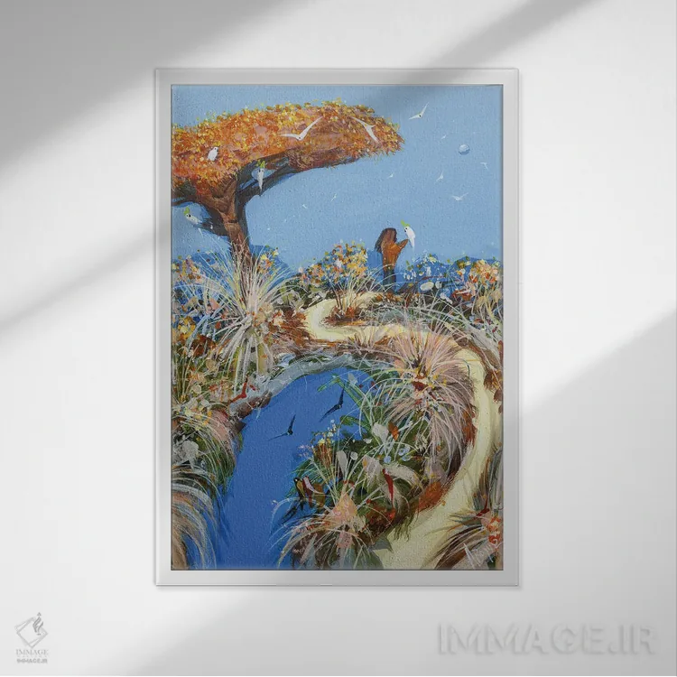 براساس پالت ترکیبی اثر، قاب بلوط روشن (چوبی) پیشنهاد اول است و استخوانی ملایم مکمل. برای سفارشهای پروژهای با ابعاد و قابهای اختصاصی با ایماژ در تماس باشید.