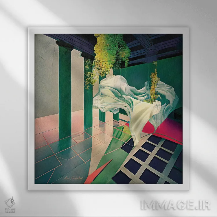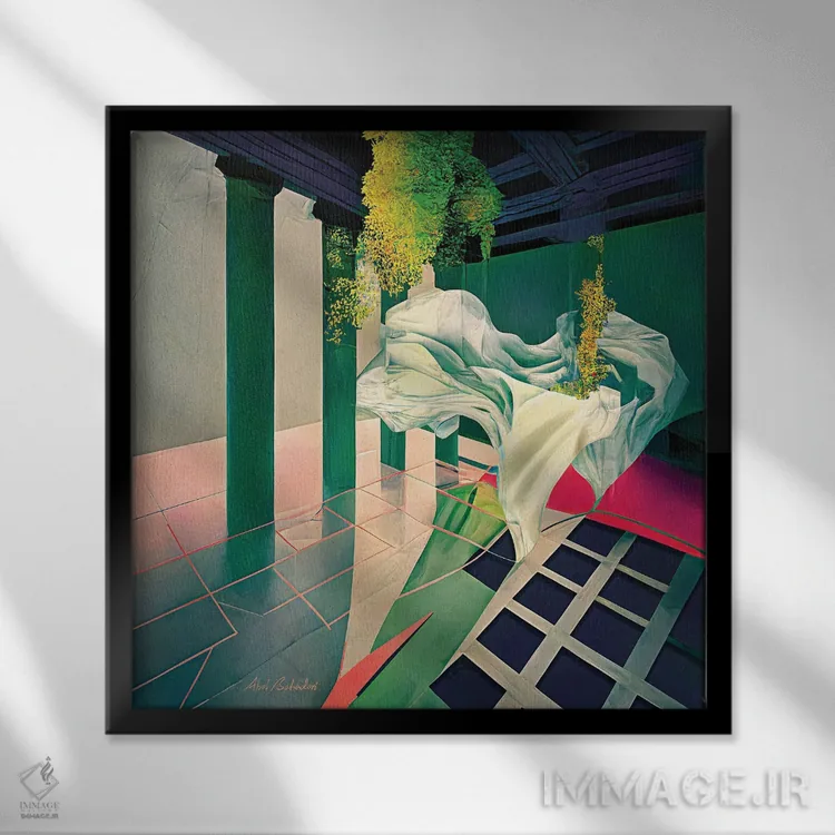 براساس پالت ترکیبی اثر، قاب تیک گرم (چوبی) پیشنهاد اول است و مشکی مات (فریم متوسط) مکمل. برای سفارشهای پروژهای با ابعاد و قابهای اختصاصی با ایماژ در تماس باشید.