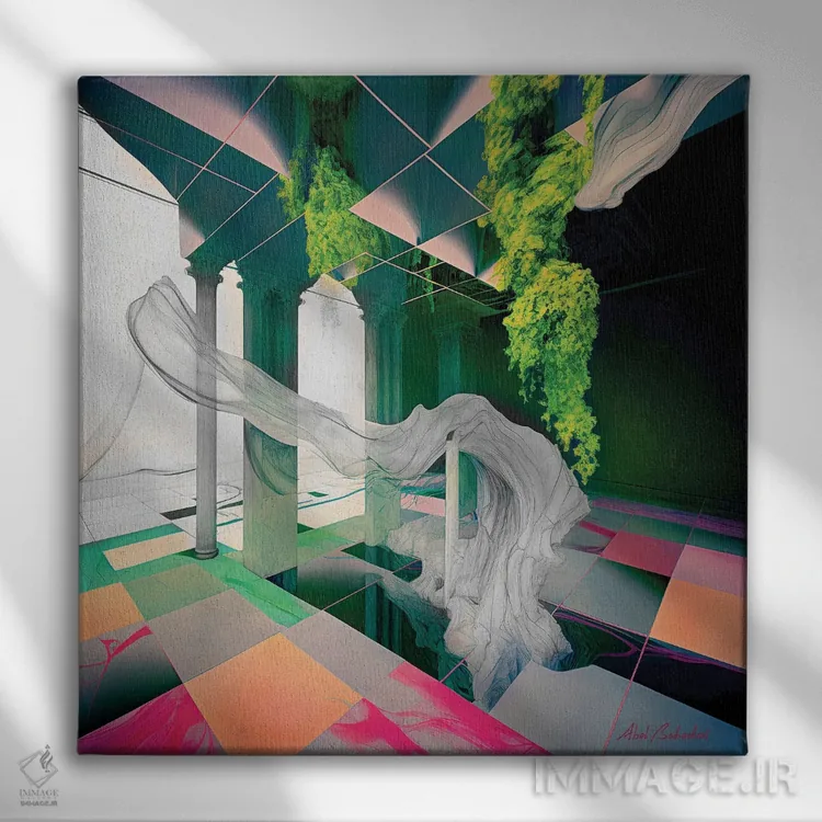 در «احیا» اثرِ «ابوال بهادری»، اتاق را مرتبتر و منسجمتر نشان دهد؛ برای لابی و فضاهای رسمی انتخابی خوشسلیقه است. با قاب مشکی مات، جلوهٔ تمیزتری پیدا میکند.