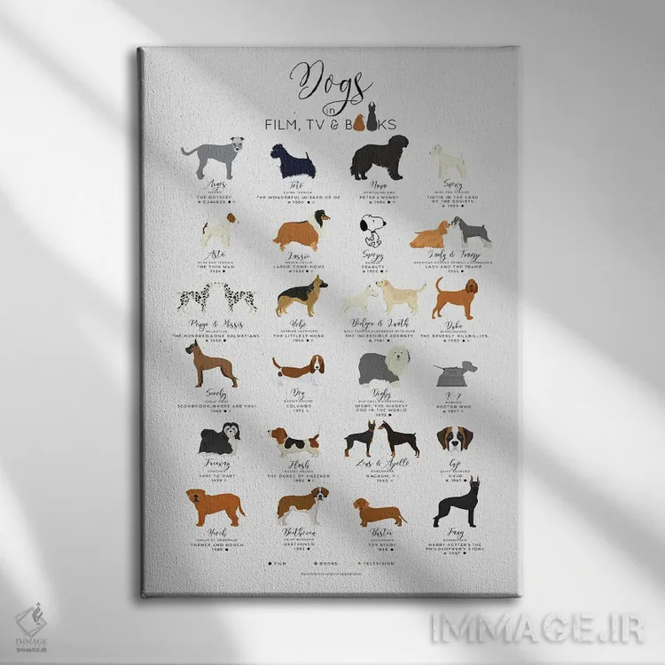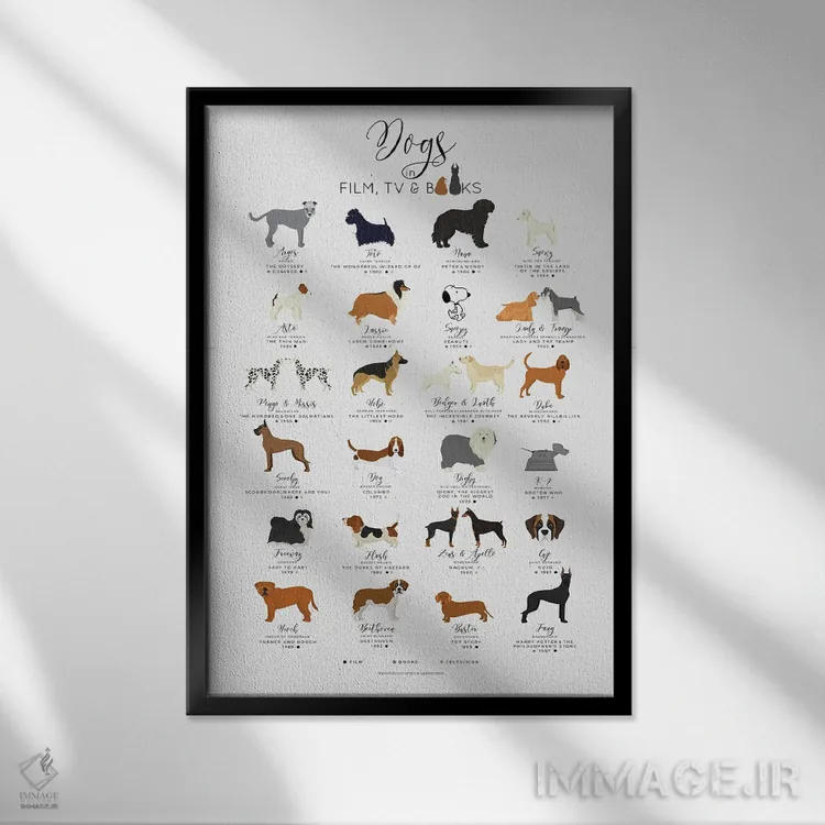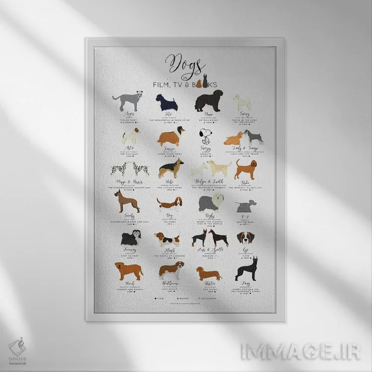 «سگها در فیلم، تلویزیون و کتابها» اثرِ «بیبلیوتوگرافی» یک لهجهی مدرن برای ترکیبهای خاکستری/سفید و نور سرد است.