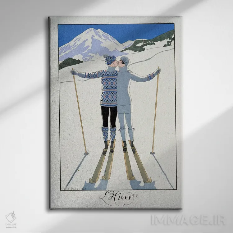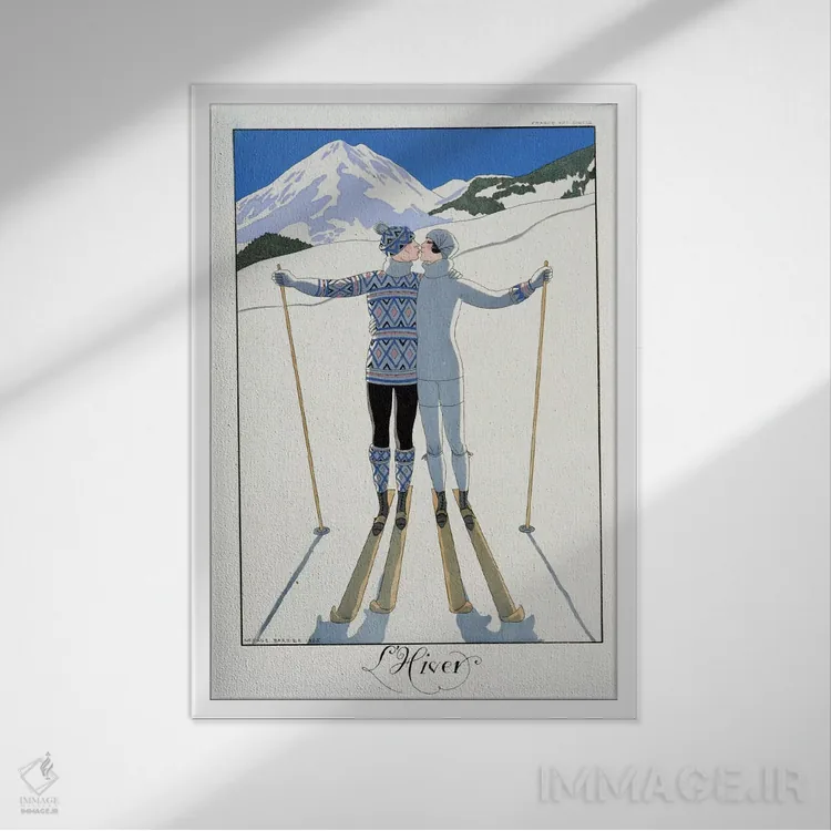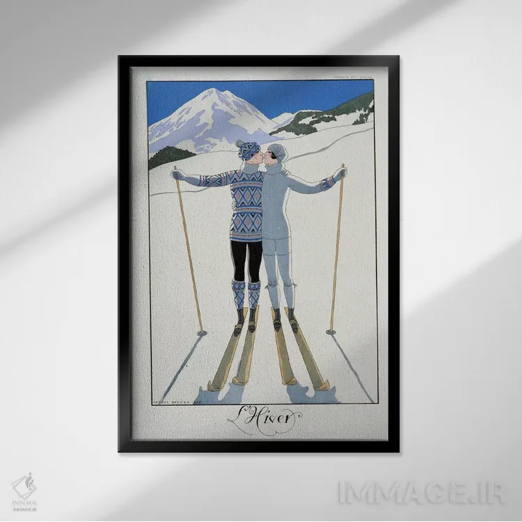 «fashion plate from 'Twentieth Century France'، 1925 (colour litho)، زمستان: عاشقان در برف، صفحهٔ مد از "فرانسه قرن بیستم"، ۱۹۲۵ (چاپ رنگی)» اثرِ «جورج باربیه (طراح و تصویرگر فرانسوی)» با چاشنی هنری، حس لوکسِ هندسی و مرتب به فضا میدهد—خوب برای نشیمنهای مدرن/نیمهکلاسیک.