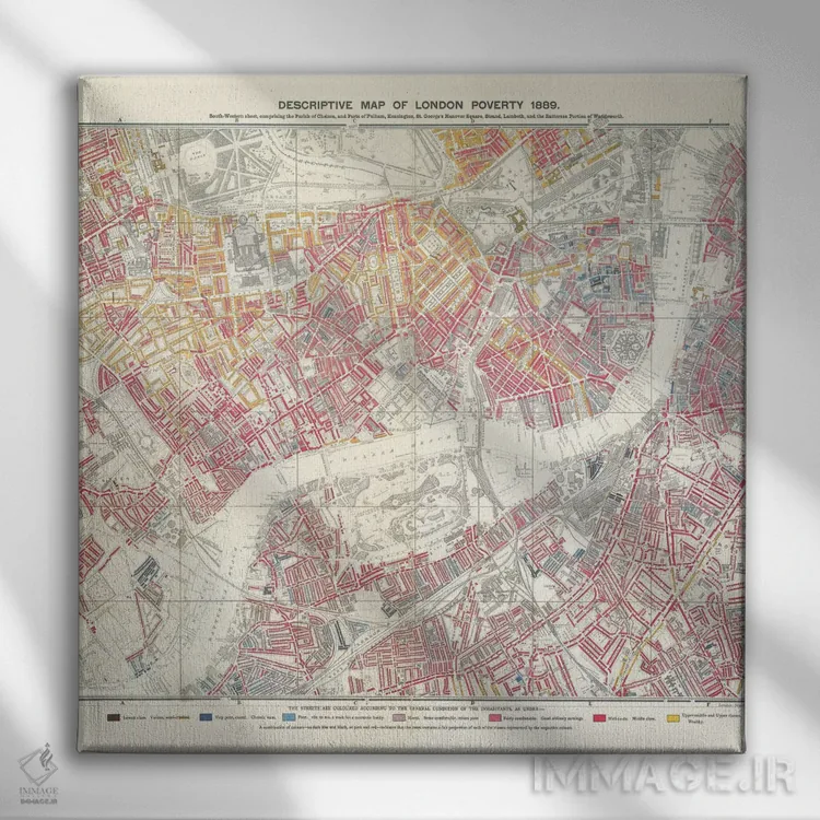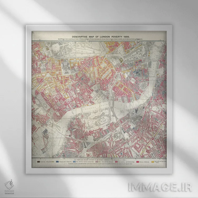 «صفحه جنوبغربی، نقشهٔ توصیفی فقر لندن، ۱۸۸۹» اثرِ «مکتب انگلیسی (سبک یا جنبش هنری)» برای فضاهای گرم و صمیمی مناسب است؛ بهخصوص کنار چوب تیره و نور زرد.