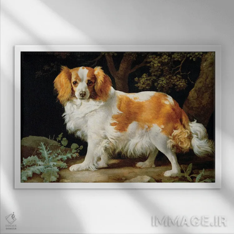 تابلو کلاسیک 1776,یک سگ اسپانیل کینگ چارلز قهوه ای و سفید در منظره ای جنگل… اثر جورج استابز