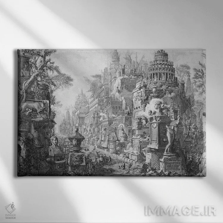 تابلو From 'Le Antichita Romane De G.B. Piranesi ', Published In Paris, 1835,صفحه آغازین تمثیلی رم و تاریخ آن، از کتاب "آثار باستانی رم" اثر پیرانزی، چاپ پاریس ۱۸۳۵ اثر جیووانی باتیستا پیرانزی (هنرمند و معمار ایتالیایی)