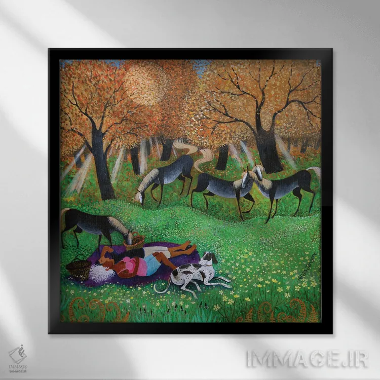 براساس پالت ترکیبی اثر، قاب تیک گرم (چوبی) پیشنهاد اول است و مشکی مات (فریم متوسط) مکمل. برای سفارشهای پروژهای با ابعاد و قابهای اختصاصی با ایماژ در تماس باشید.