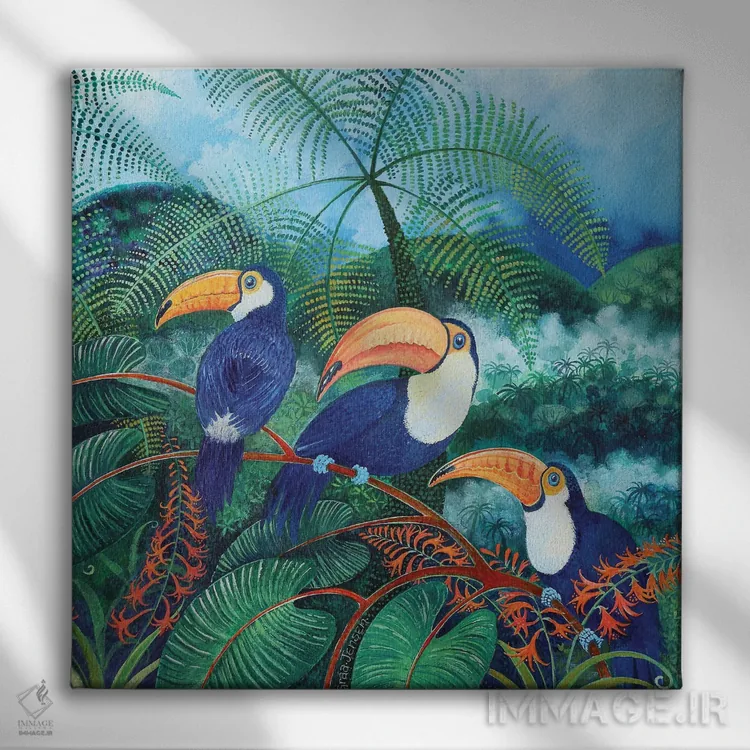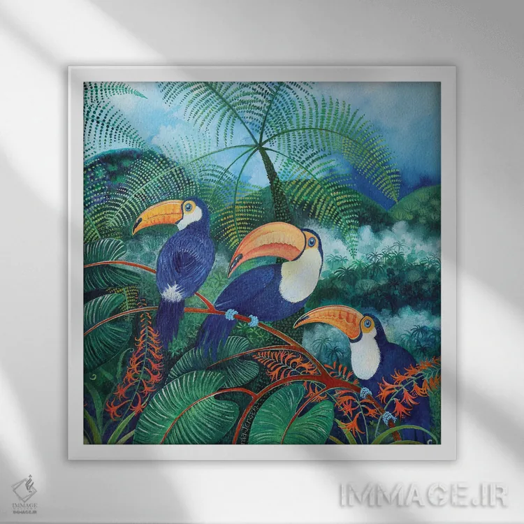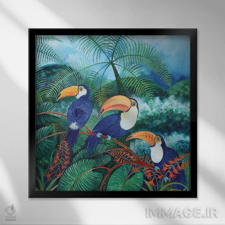 در «توکانها، ۲۰۱۲ (پرندگان گرمسیری)» اثرِ «لیزا گرا یِنسن»، حضور حیوانات فضا را صمیمیتر و دعوتکنندهتر نشان میدهد؛ برای هدیهدادن به دوستداران حیوانات انتخابی خوشسلیقه است. هر بار نگاهش میکنید، یک جزئیات تازه به چشم میآید.