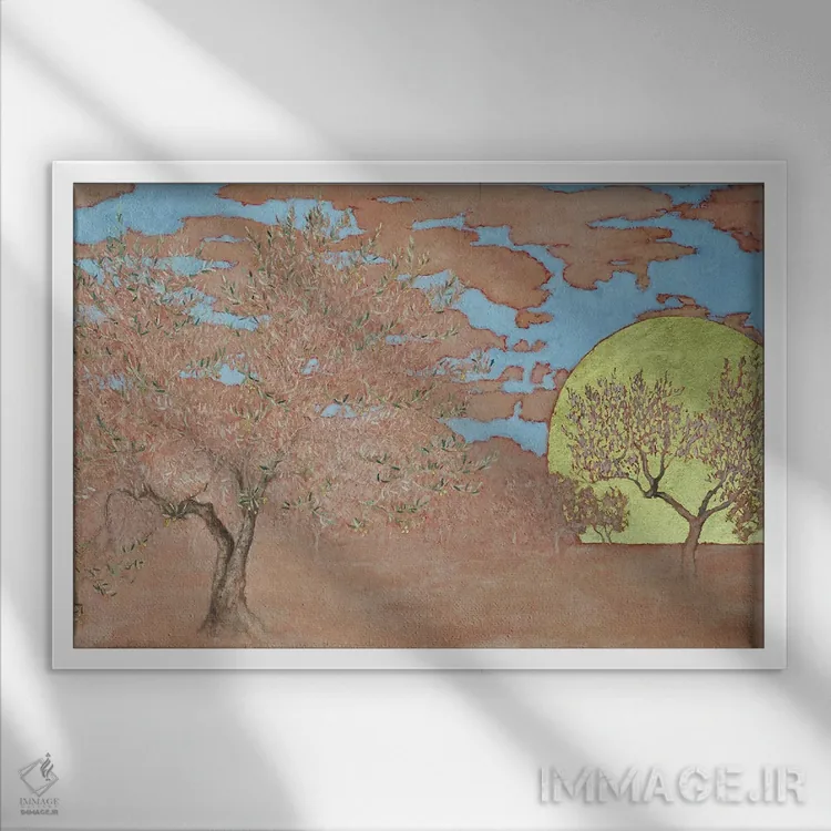 براساس پالت ترکیبی اثر، قاب بلوط روشن (چوبی) پیشنهاد اول است و استخوانی ملایم مکمل. برای سفارشهای پروژهای با ابعاد و قابهای اختصاصی با ایماژ در تماس باشید.
