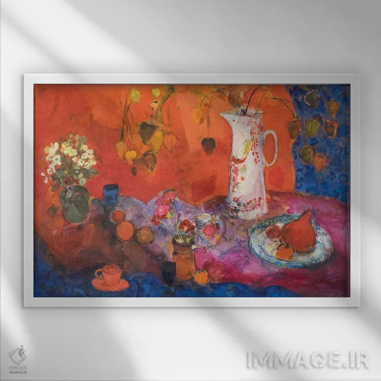 تابلو طبیعت بیجان قرمز با کوزه سفید و میوه اثر آن اورام