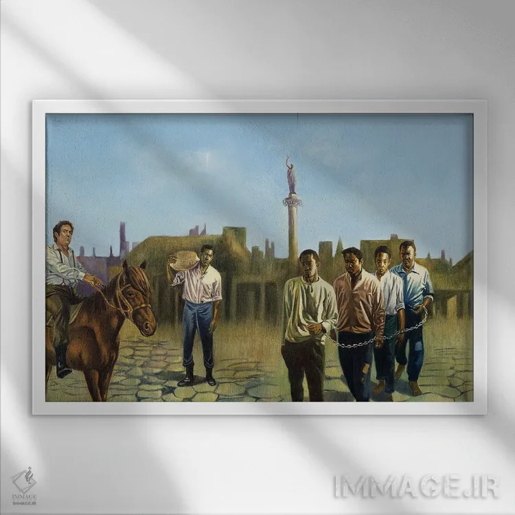 براساس پالت ترکیبی اثر، قاب بلوط روشن (چوبی) پیشنهاد اول است و استخوانی ملایم مکمل. برای سفارشهای پروژهای با ابعاد و قابهای اختصاصی با ایماژ در تماس باشید.