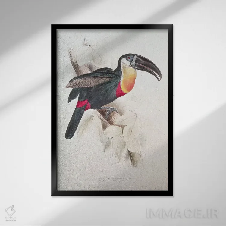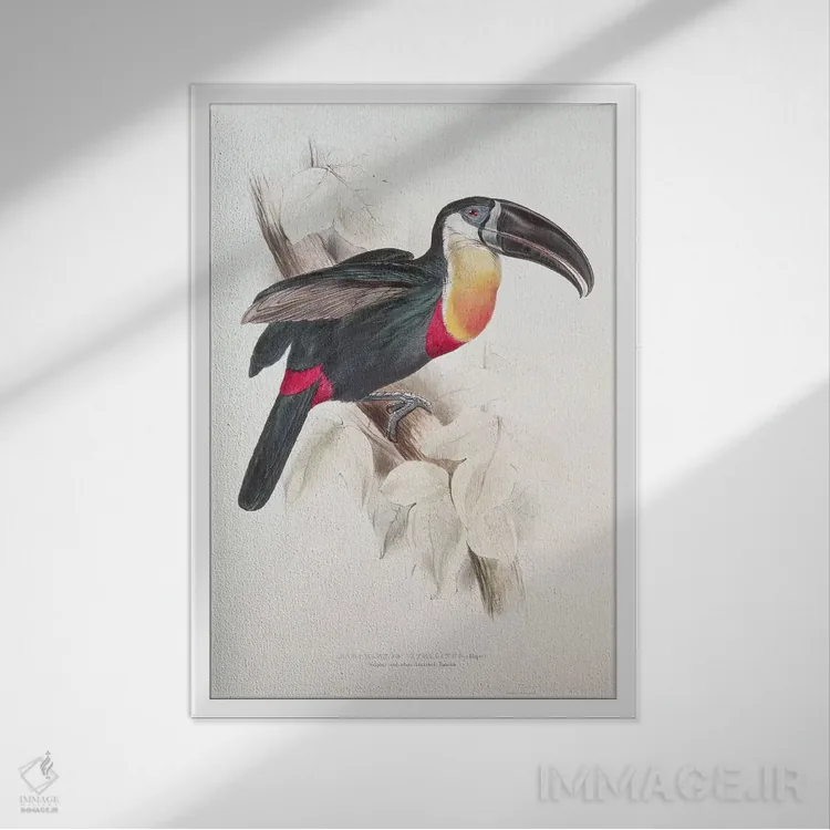 اگر میخواهید دیوار کمی سرزندگیِ محترمانه داشته باشد، «توکان سینهسفید و گوگردی، قرن نوزدهم» اثرِ «ادوارد لیر (شاعر و تصویرگر انگلیسی)» بافت و جزئیات را طوری نشان میدهد که نگاه میماند، برای نشیمنهای خانوادگی گزینهٔ مناسبیست. در کنار گیاهان و نور طبیعی، جذابتر هم میشود.