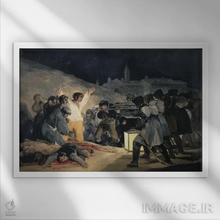 «1808)، 1814، اعدام مدافعان مادرید (۳ مه ۱۸۰۸)، ۱۸۱۴» اثرِ «فرانسیسکو گویا (نقاش و چاپگر اسپانیایی)» میتواند حسِ گالریوار و حرفهای به دیوار بدهد.