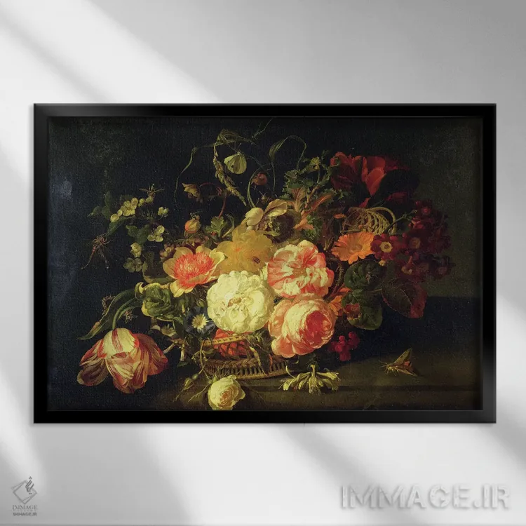 تابلو گل‌ها و حشرات، ۱۷۱۱ اثر ریچل رویش - نمای قاب‌دار مشکی