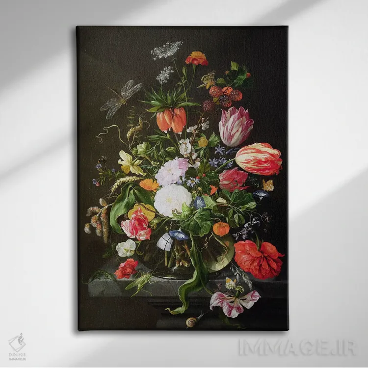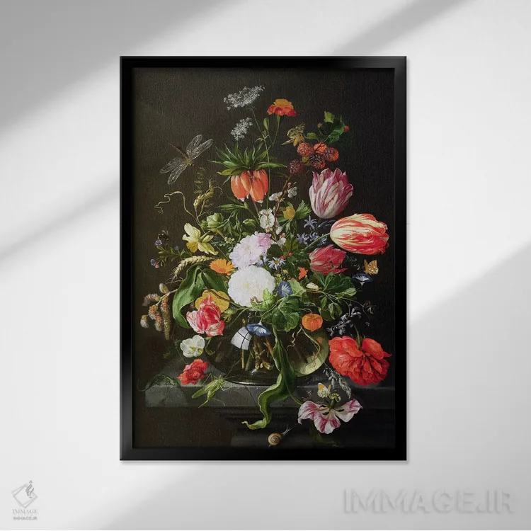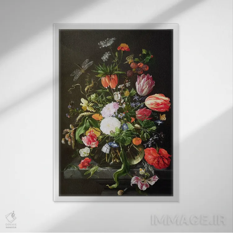 در «طبیعت بیجان گلها» اثرِ «یان داویدز د هیم (نقاش هلندی)»، حضور حیوانات به فضا، گرمیِ ملایم اضافه میکند؛ برای اتاق کودک (بدون لحن کودکانه) انتخابی خوشسلیقه است. برای دیوار گالریوار هم گزینهٔ خوبیست.