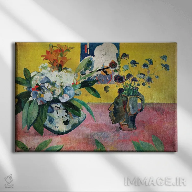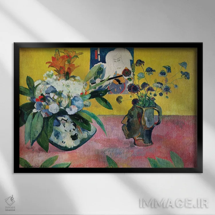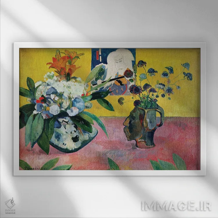 تابلو کلاسیک طبیعت بی جان با گلدان سرشکل و چاپ چوبی ژاپنی اثر پل گوگن