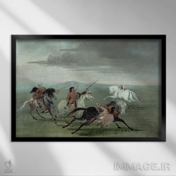 برای دیوارهای ساده، «هنرنماییهای رزمی اسبسواری قبیله کومانچی (بومی آمریکا)» اثرِ «جورج کتلین (نقاش بومیان آمریکا)» بافت و جزئیات را طوری نشان میدهد که نگاه میماند؛ برای خانههایی با چوب و پارچههای گرم انتخابی خوشسلیقه است. حسش صمیمی است، اما کیفیتش جدی و خوشپرداخت.