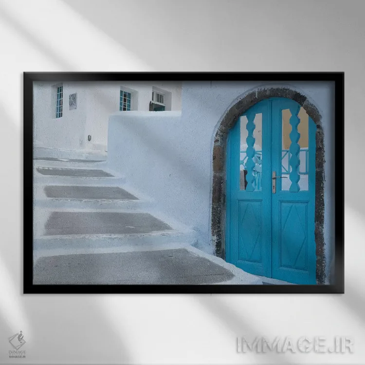 «یونان، سانتورینی. در آبیرنگ به کوچهی خلوت خانههای سفیدپوش در پیرگوس جان بخشیده است» اثرِ «برندا ثارپ» با حالوهوای این اثر، برای بالای کنسول یا کنار قابهای ساده، ترکیب چشمنوازی میسازد.