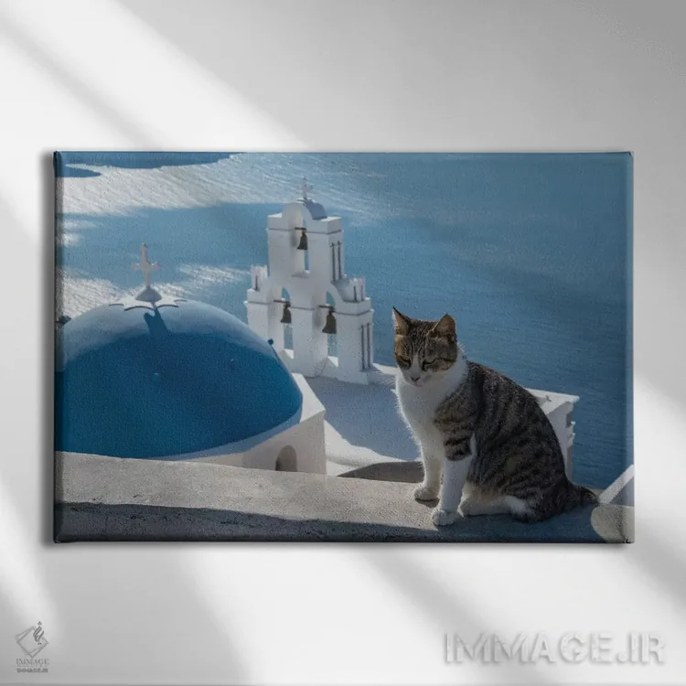 تابلو یونان، سانتورینی. گربهای روی دیوار بالای ناقوسهای معروف فیرا ژست گرفته است اثر برندا ثارپ