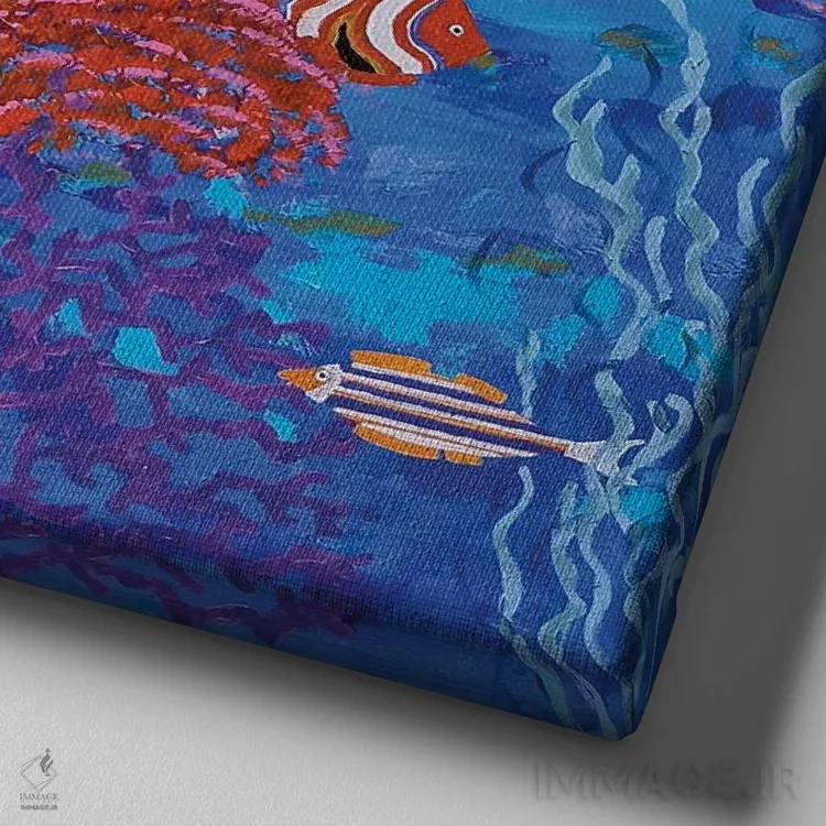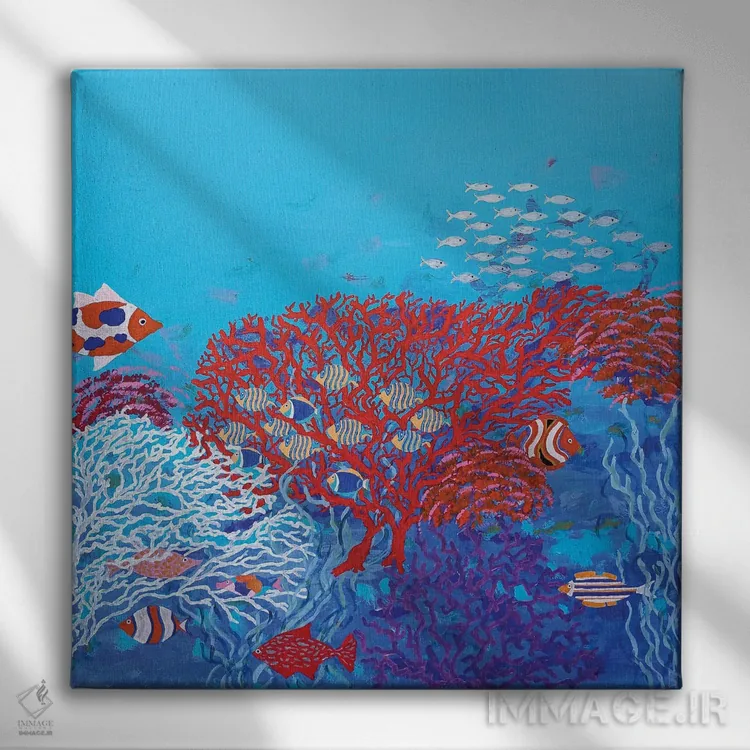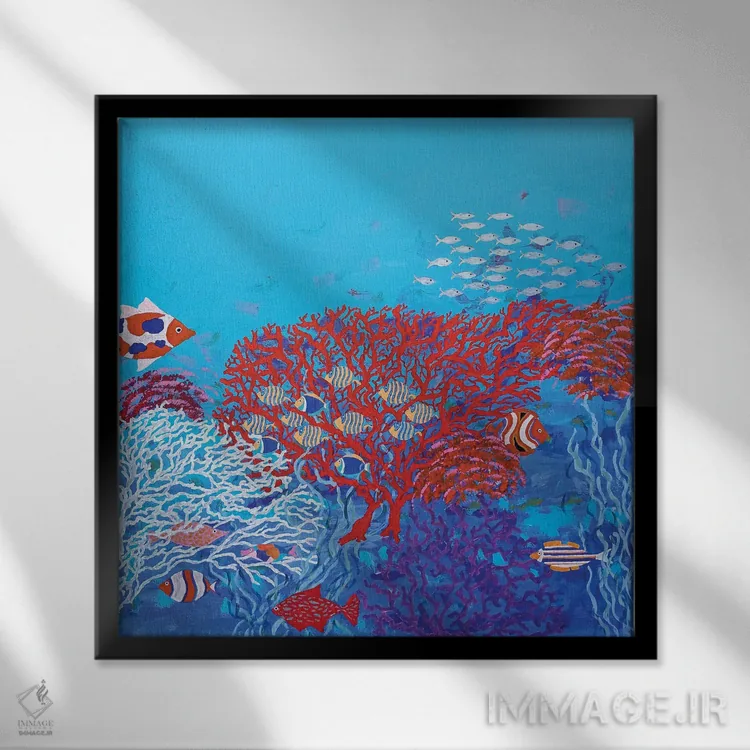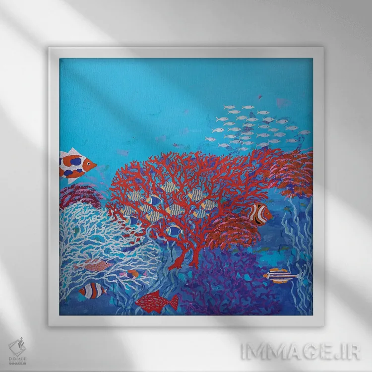 اگر میخواهید دیوار کمی سرزندگیِ محترمانه داشته باشد، «ماهیهای رنگارنگ در میان مرجانها» اثرِ «بریت بردال نیلسن» بافت و جزئیات را طوری نشان میدهد که نگاه میماند، برای خانههایی با چوب و پارچههای گرم گزینهٔ مناسبیست. با نورپردازی نقطهای، جذابتر هم میشود.