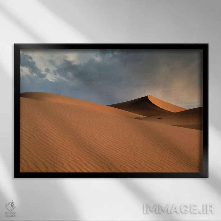 تابلو تپه‌های شنی در بیابان صحرا هنگام غروب به رنگ نارنجی می‌درخشند اثر بتی سدرکوئیست - نمای قاب‌دار مشکی