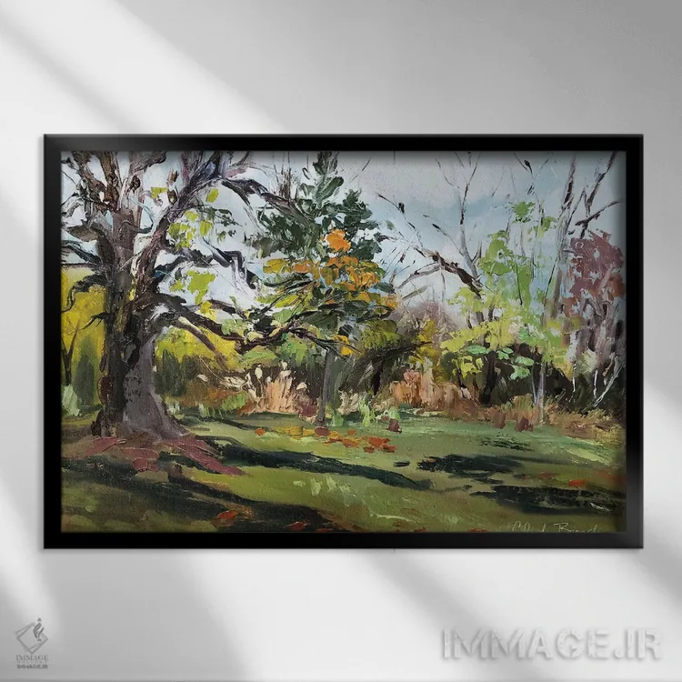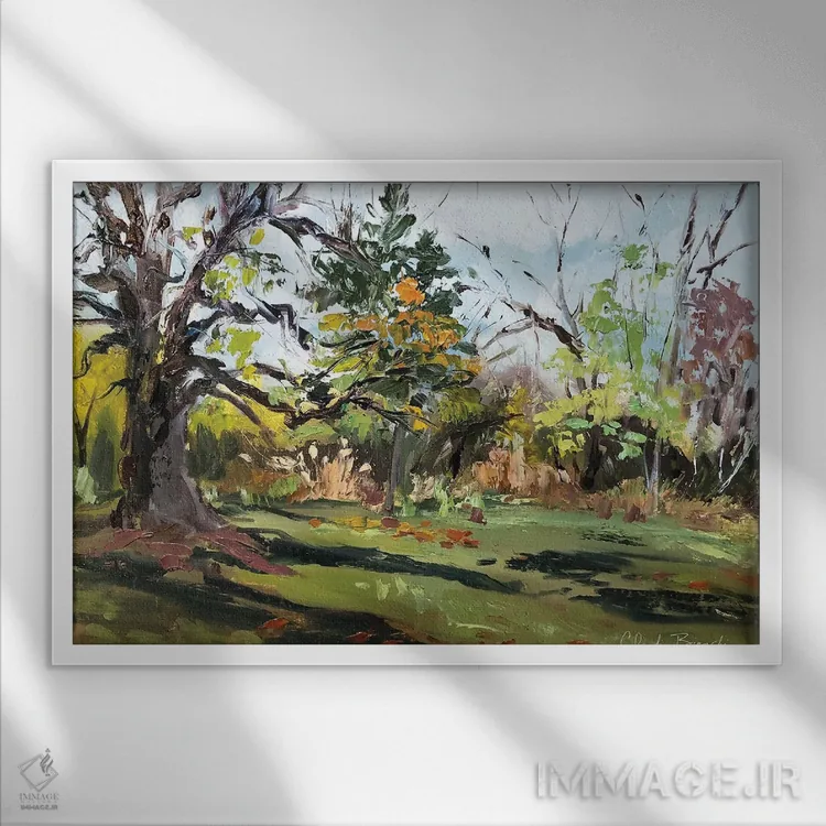 براساس پالت ترکیبی اثر، قاب بلوط روشن (چوبی) پیشنهاد اول است و استخوانی ملایم مکمل. برای سفارشهای پروژهای با ابعاد و قابهای اختصاصی با ایماژ در تماس باشید.