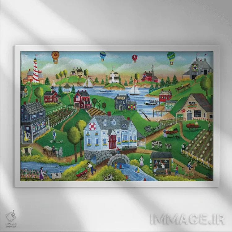 تابلو دکوراتیو دهکده کنار دریا با بالون های هوای داغ اثر شریل بارتلی