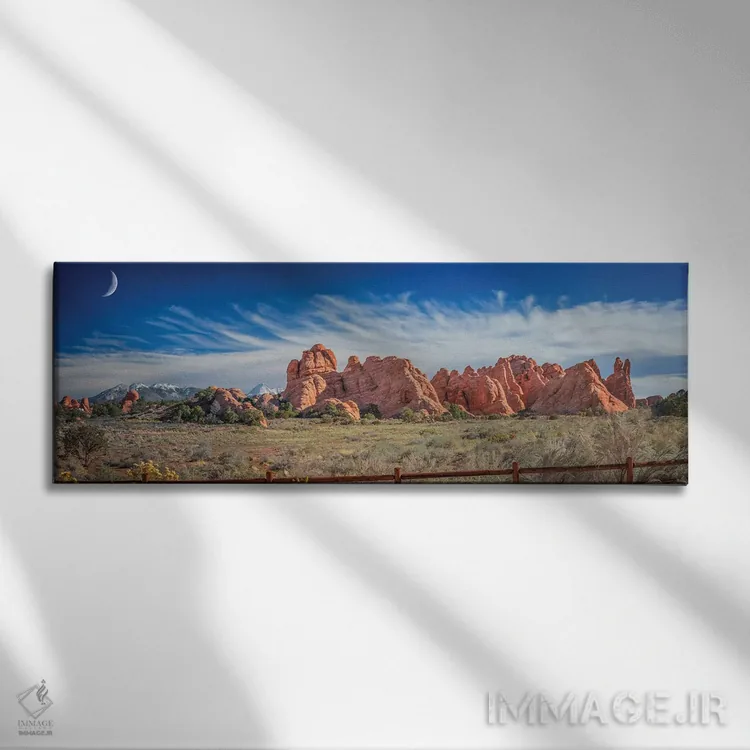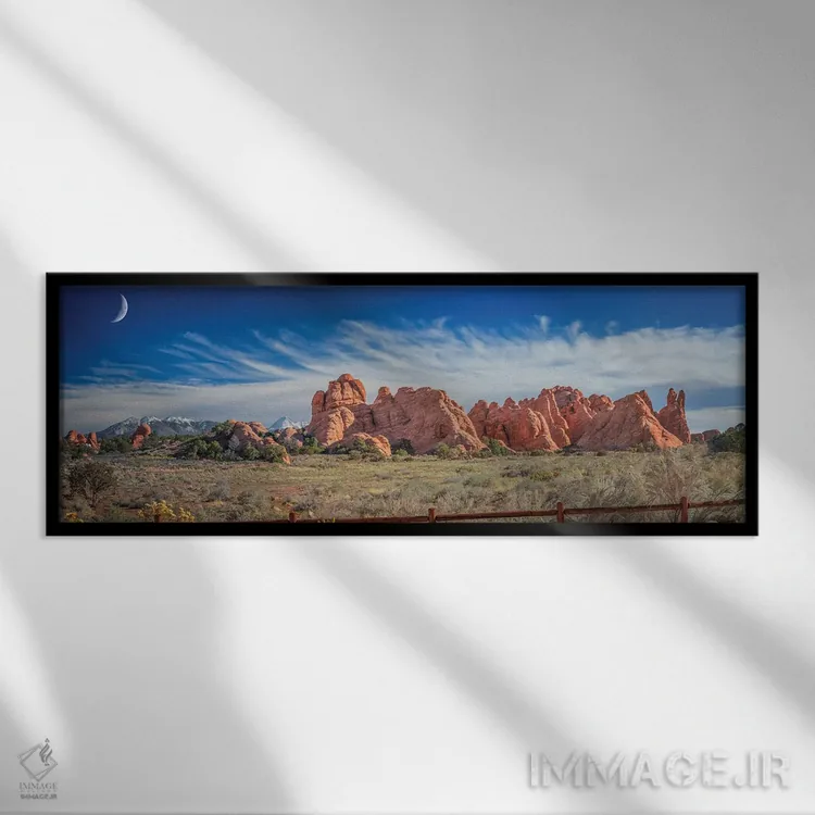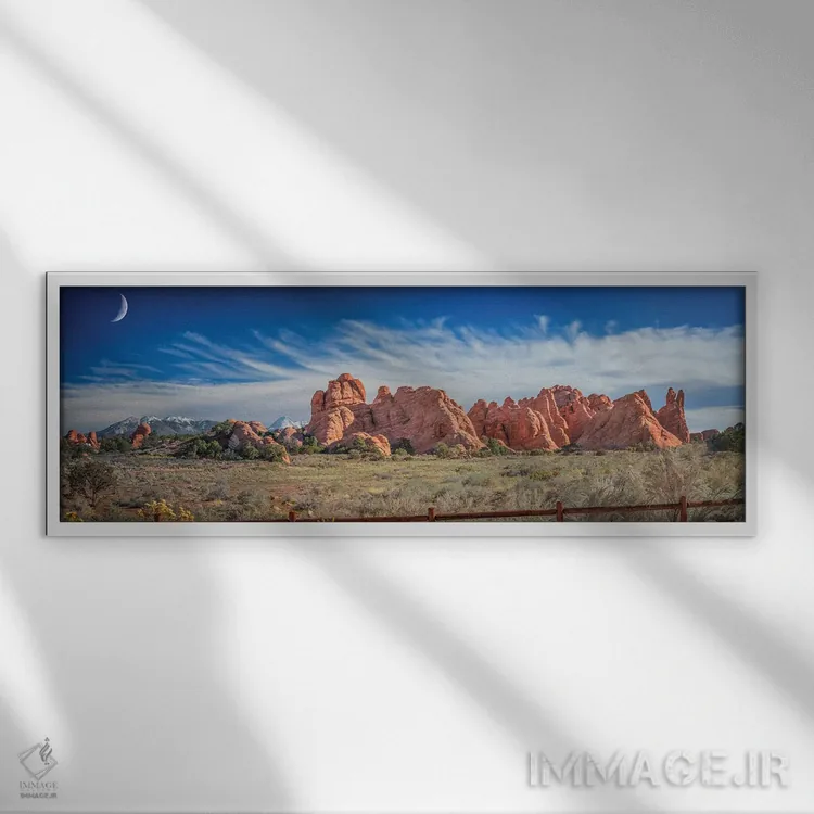 در این اثر، «ماه بالای پارک ملی آرچز» اثرِ «عکاسی جاناتان راس» چیدمان را از حالت پراکنده خارج میکند؛ برای دکورهای کلاسیک با چوب و پارچه پیشنهاد میشود. با نور گرم یا سرد، خوانایی و وقارش را حفظ میکند.