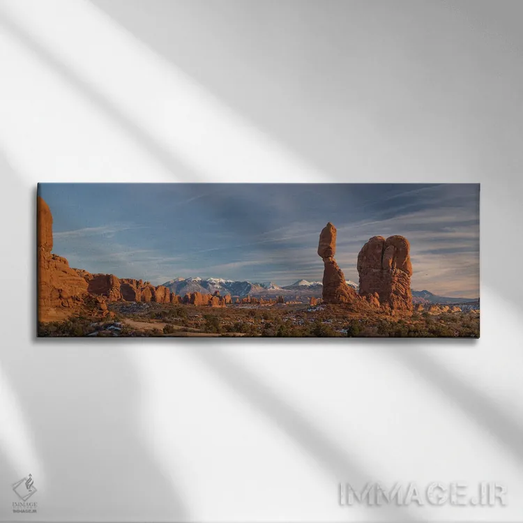 «Utah. Panoramic image of Balanced Rock at sunset، Arches National Park.، ایالات متحده، یوتا. تصویر پانوراما از سنگ متعادل در غروب، پارک ملی آرچز» اثرِ «جودیت زیمرمن» از آن انتخابهاییست که به دیوار، شخصیت و جهت میدهد؛ برای فضاهای کمنور که به «نقطهٔ روشن» نیاز دارند انتخابی عالی است. برای هدیه دادن هم انتخابی محترمانه و امن است.