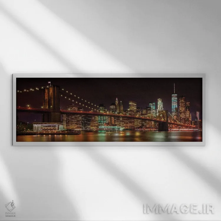 تابلو خط افق منهتن و پل بروکلین در منظره شبانه رویایی اثر ملانی ویولا - نمای قاب‌دار سفید