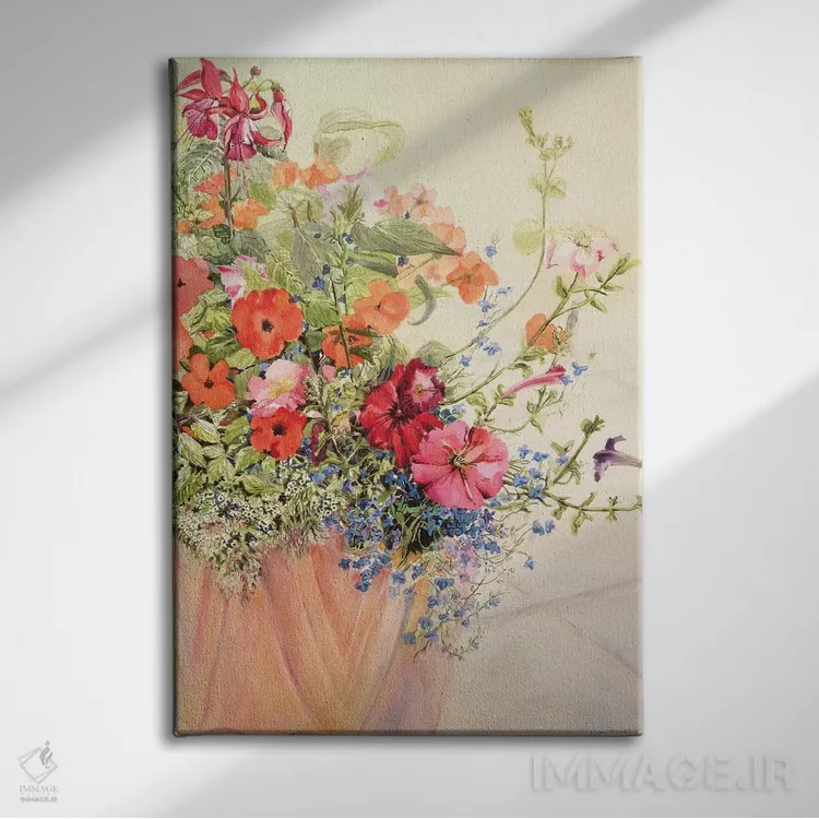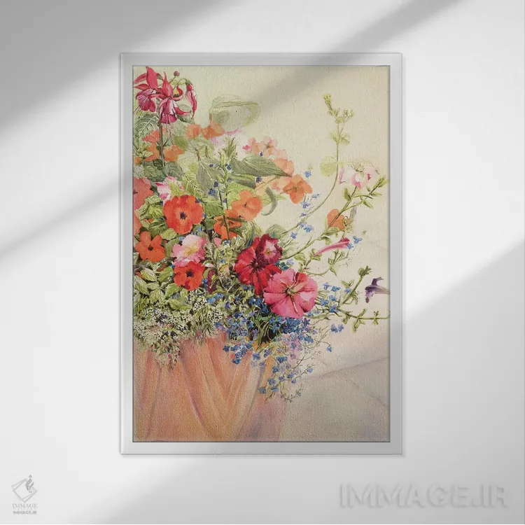 اگر دوست دارید دیوار روشنتر و آرامتر دیده شود، «Lobelias، Busy Lizzies and Fuschia in a Terracotta Pot، پتونیا، لوبلیا، گیاه لیزی و فوچیا در گلدان سفالی» اثرِ «ژوان توسی» حس طراوت را بدون شلوغی وارد اتاق میکند، برای دکورهای اسکانباوراوی گزینهٔ مناسبیست. با قاب روشن یا چوبی، حس طبیعیتری پیدا میکند.