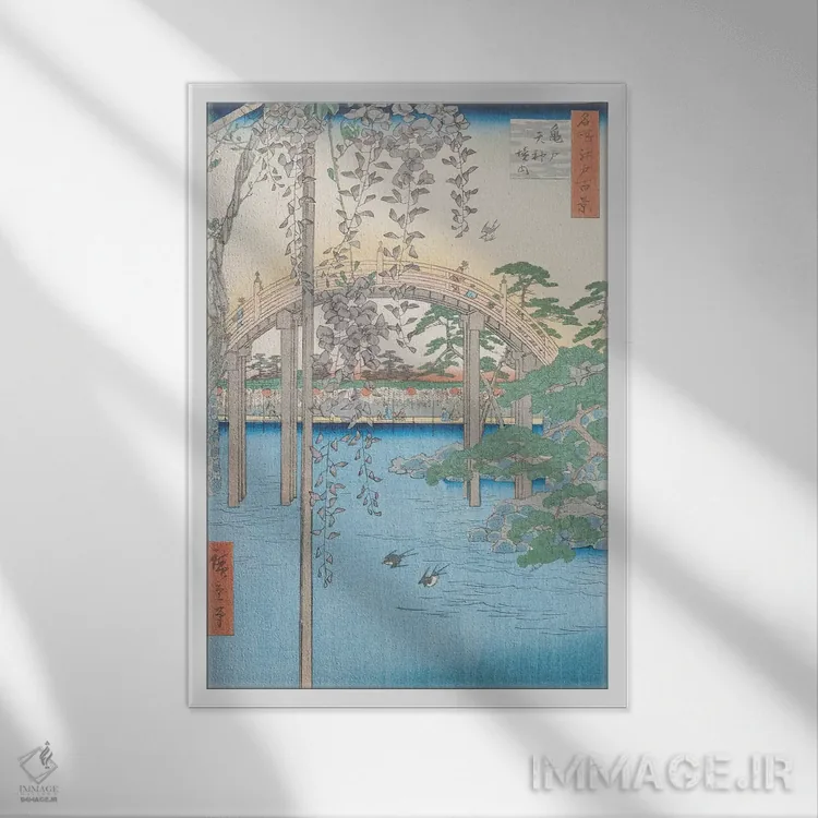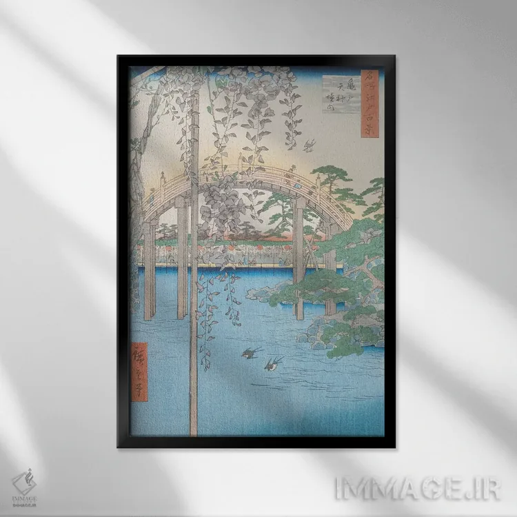 «کامئیدو تنجین کِیدای (داخل معبد کامئیدو تنجین) (ژاپن)» اثرِ «اوتاگاوا هیروشگه (نقاش و چاپگر ژاپنی اوکییو—ئه)» با حالوهوای آسیایی، کنار نور ملایم و متریالهای طبیعی (چوب/سنگ) بسیار خوشفرم دیده میشود.