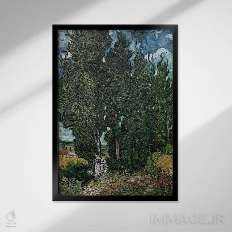 «درختان سرو، حدود ۱۸۸۹—۹۰» اثرِ «ونسان ون گوگ (نقاش مشهور هلندی پستامپرسیونیسم)» مثل یک نفس تازه است؛ تعادل رنگیِ لطیفی به چیدمان میدهد؛ برای کنار میز آرایش یا کنسول انتخابی خوشسلیقه است. حضورش آرام است، اما بیاثر نیست.