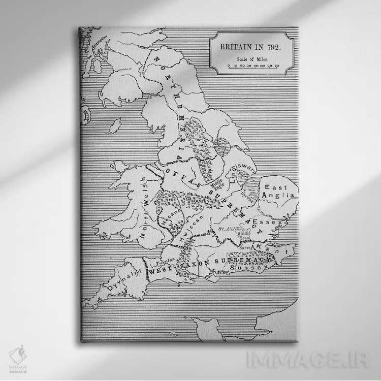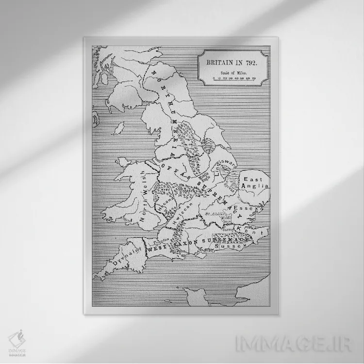 «بریتانیا در سال ۷۹۲، سه پادشاهی ۶۸۵ تا ۸۲۸، تاریخچه کوتاه ملت انگلیس» اثرِ «مکتب انگلیسی (سبک یا جنبش هنری)» کنار پوسترها و قابهای ساده، یک ترکیب دلنشین و متعادل میسازد.