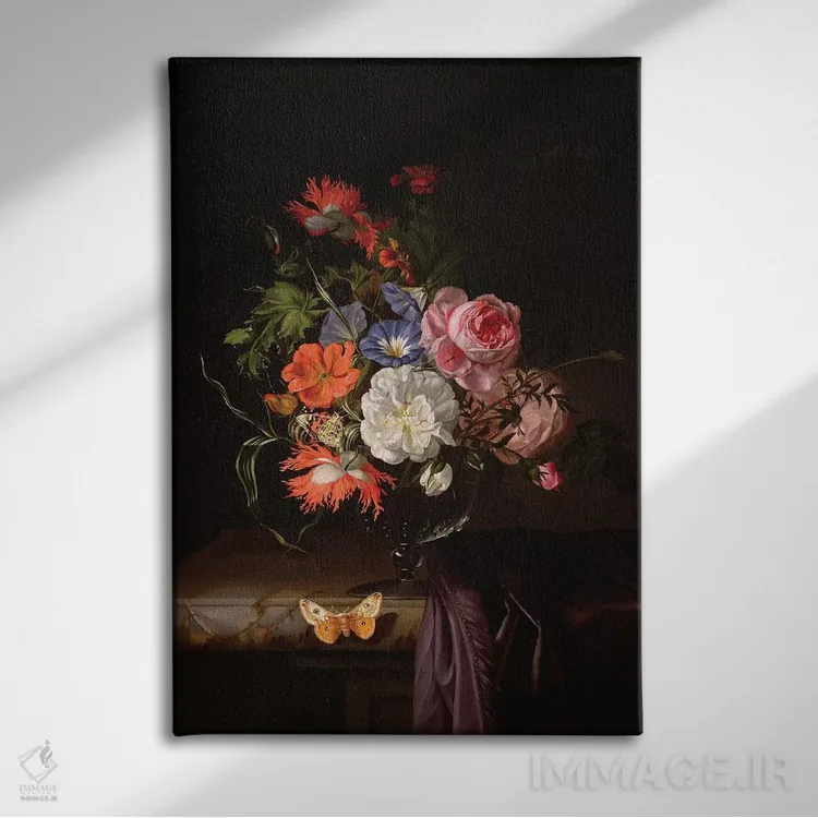 تابلو طبیعت بی‌جان گل‌ها در گلدانی روی رف اثر ریچل رویش - نمای روبه‌رو روی دیوار