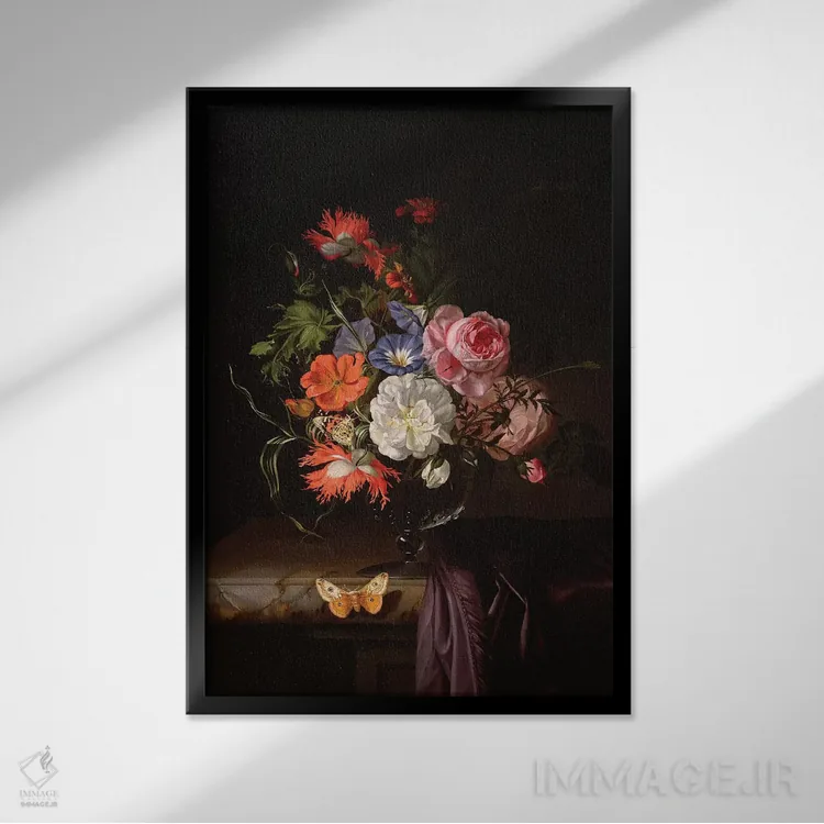 تابلو طبیعت بی‌جان گل‌ها در گلدانی روی رف اثر ریچل رویش - نمای قاب‌دار مشکی