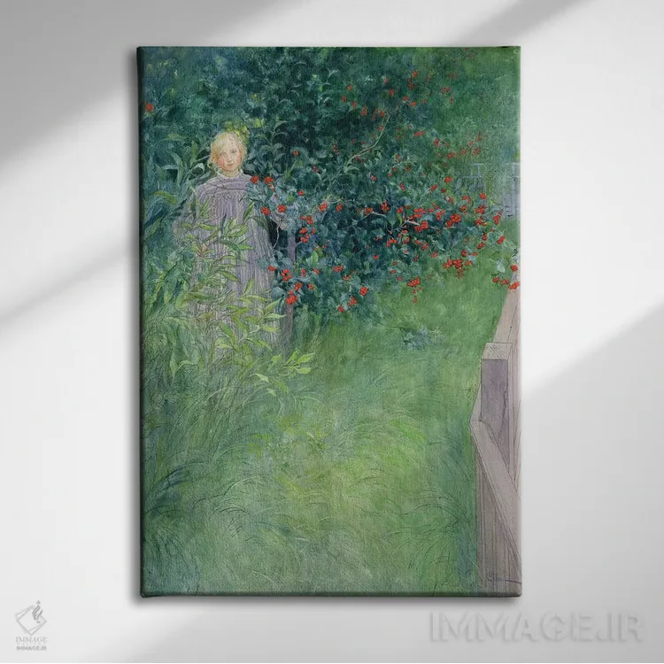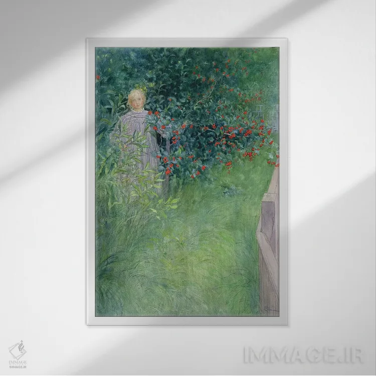«در حصار گیاه زالزالک» اثرِ «کارل لارسون (نقاش و تصویرگر سوئدی)» مثل یک نفس تازه است؛ در کنار چوب و پارچههای روشن، عالی مینشیند؛ برای راهروهای مینیمال انتخابی خوشسلیقه است. فضا را شلوغ نمیکند؛ فقط لطیفترش میکند.