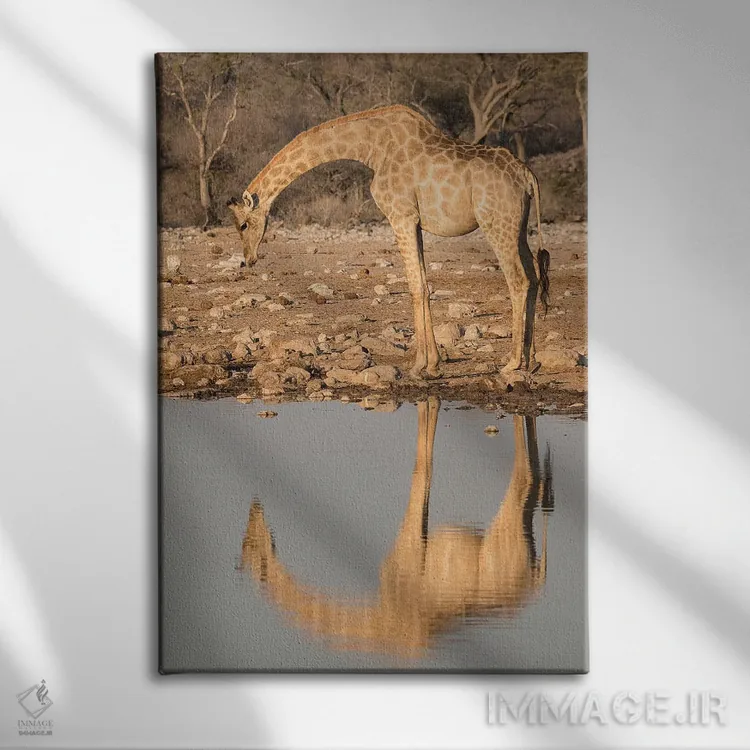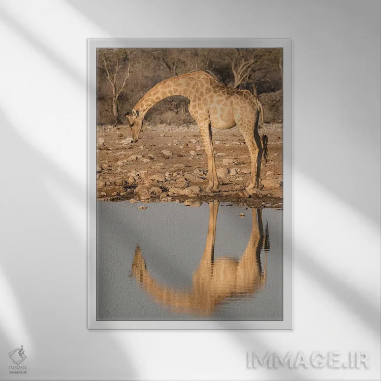«زرافهای که برای نوشیدن آب در آبگیر خم شده و تصویرش در آب منتصویر شده است، پارک ملی اتوشا، نامیبیا» اثرِ «برندا ثارپ» میتواند در دکور، مثل یک امضای ظریف عمل کند؛ برای اتاق کار و گوشهٔ مطالعه پیشنهاد میشود. در چیدمانهای مختلف، هماهنگپذیر و انعطافدار است.