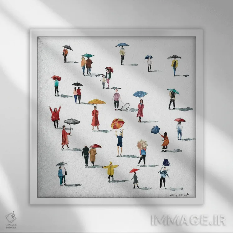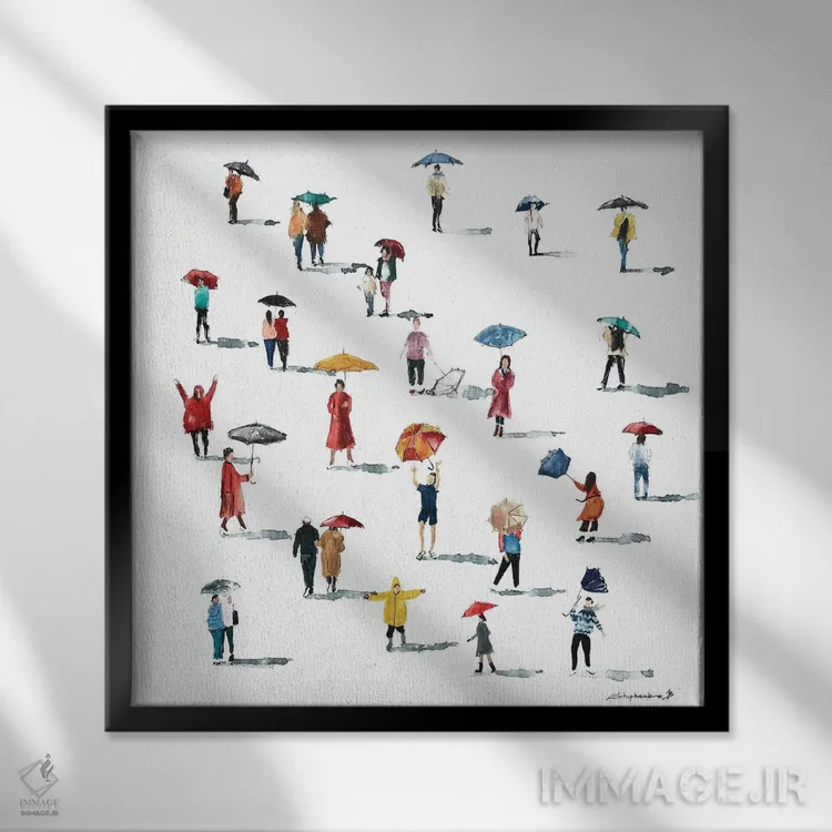 تابلو مردم با چترها اثر بوگدان شیپتنکو - نمای قاب‌دار سفید