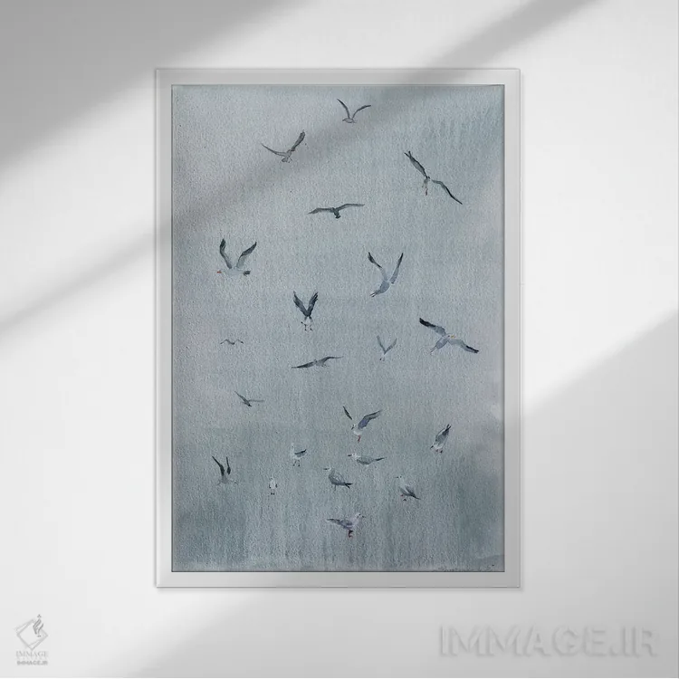 تابلو مرغان دریایی روی خاکستری اثر بوگدان شیپتنکو - نمای قاب‌دار سفید