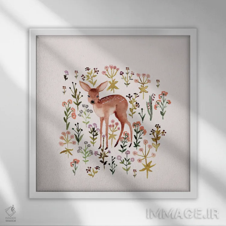 تابلو آهوچه و گل‌ها اثر برنادت اوربانویک - نمای قاب‌دار سفید