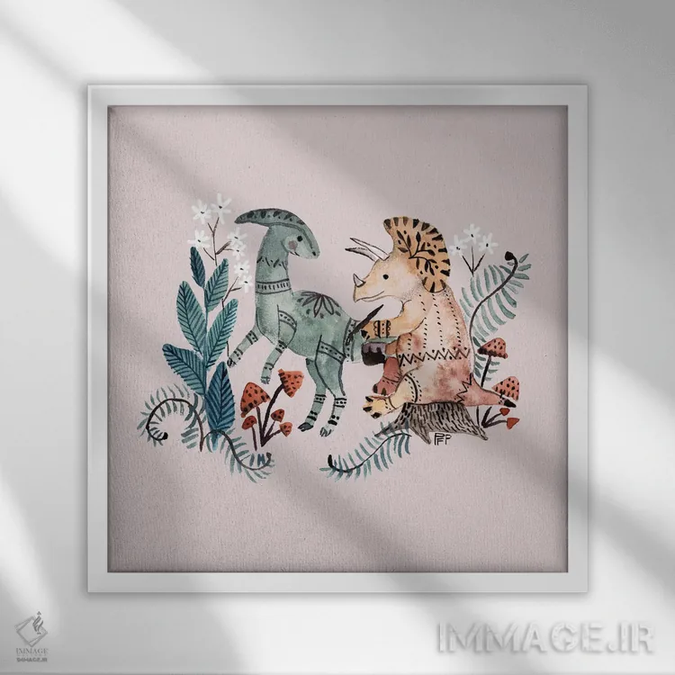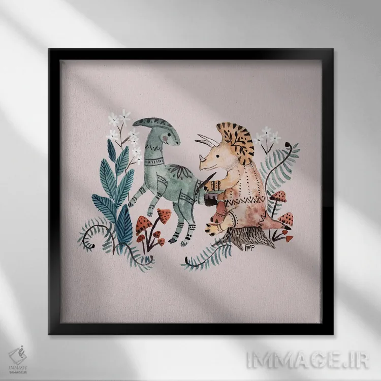 تابلو دایناسورهای قبیله‌ای اثر برنادت اوربانویک - نمای قاب‌دار سفید
