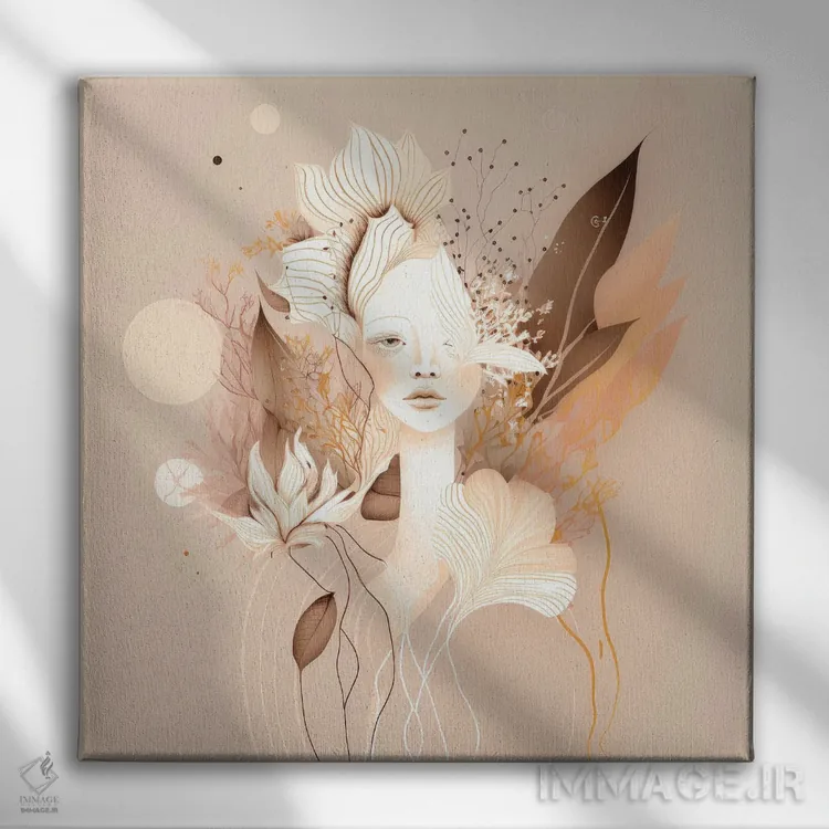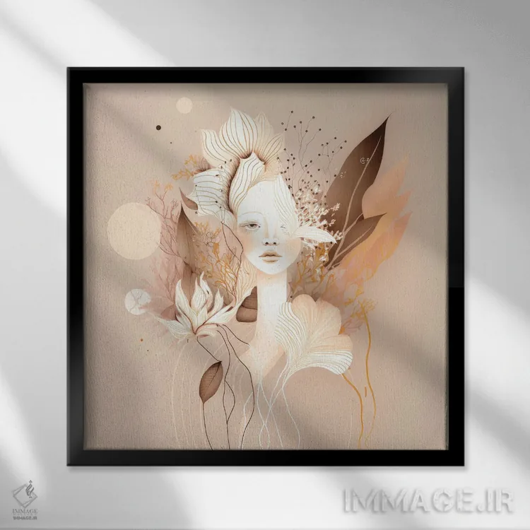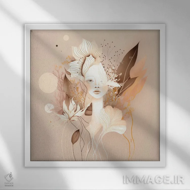 براساس پالت گرم اثر، قاب بلوط روشن (چوبی) پیشنهاد اول است و استخوانی ملایم مکمل. برای سفارشهای پروژهای با ابعاد و قابهای اختصاصی با ایماژ در تماس باشید.