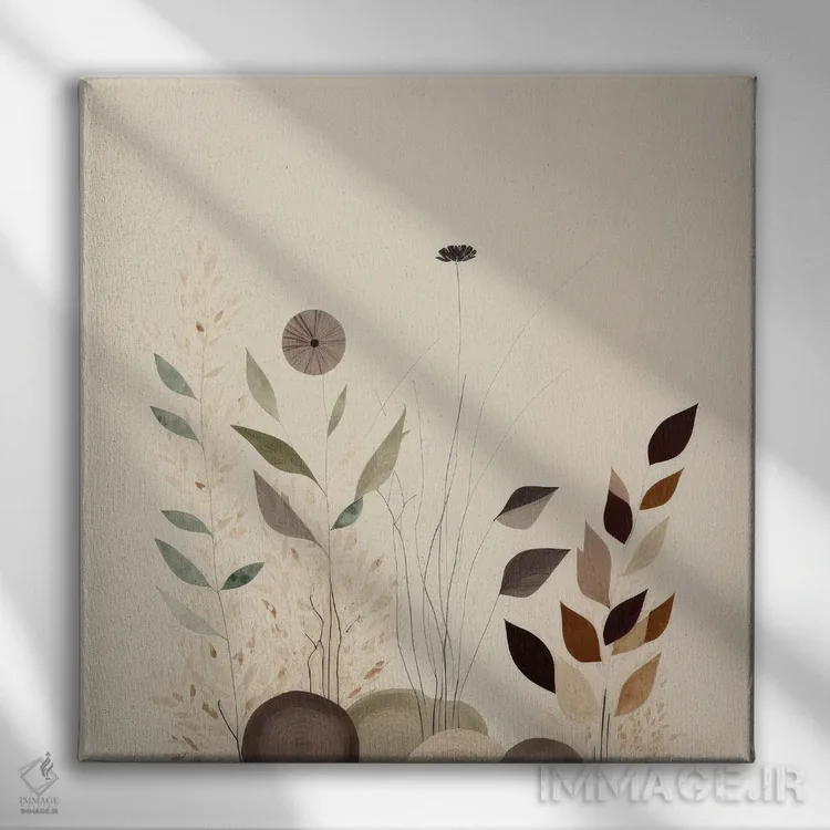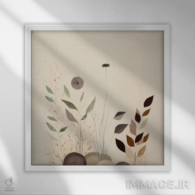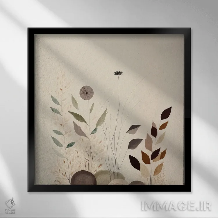 براساس پالت گرم اثر، قاب بلوط روشن (چوبی) پیشنهاد اول است و استخوانی ملایم مکمل. برای سفارشهای پروژهای با ابعاد و قابهای اختصاصی با ایماژ در تماس باشید.