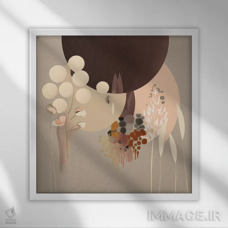 براساس پالت گرم اثر، قاب بلوط روشن (چوبی) پیشنهاد اول است و استخوانی ملایم مکمل. برای سفارشهای پروژهای با ابعاد و قابهای اختصاصی با ایماژ در تماس باشید.