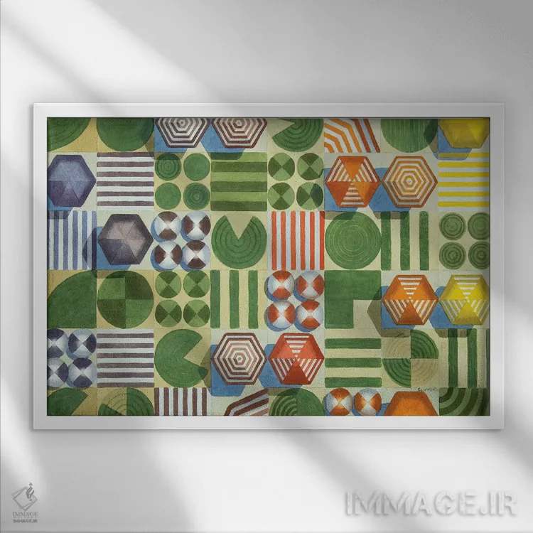 براساس پالت ترکیبی اثر، قاب تیک گرم (چوبی) پیشنهاد اول است و مشکی مات (فریم متوسط) مکمل. برای سفارشهای پروژهای با ابعاد و قابهای اختصاصی با ایماژ در تماس باشید.
