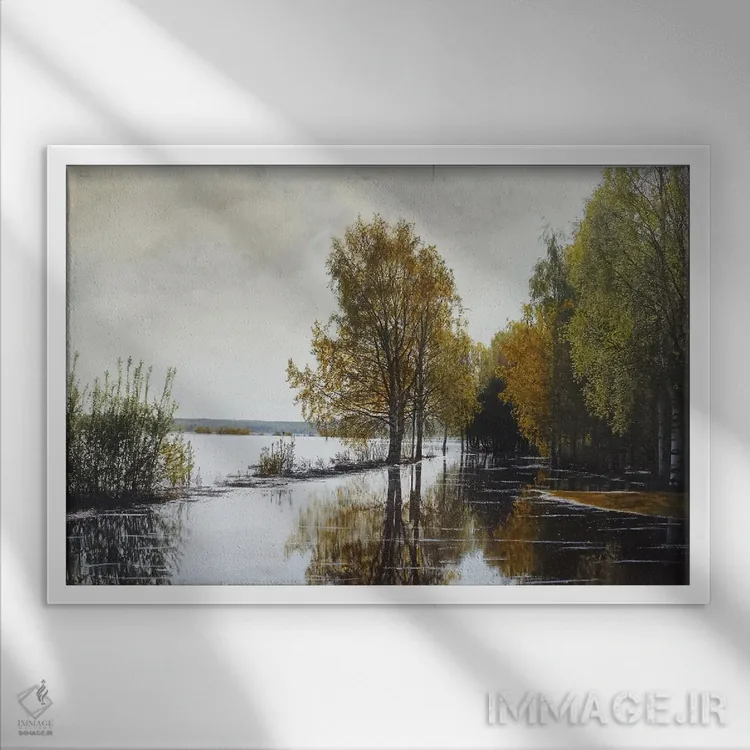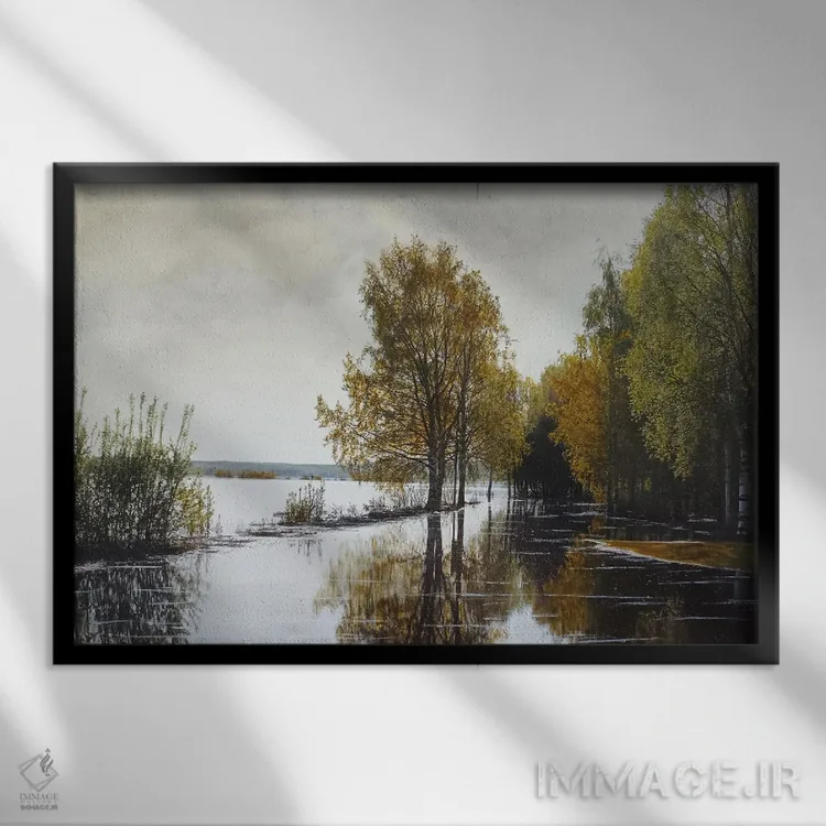براساس پالت گرم اثر، قاب بلوط روشن (چوبی) پیشنهاد اول است و استخوانی ملایم مکمل. برای سفارشهای پروژهای با ابعاد و قابهای اختصاصی با ایماژ در تماس باشید.